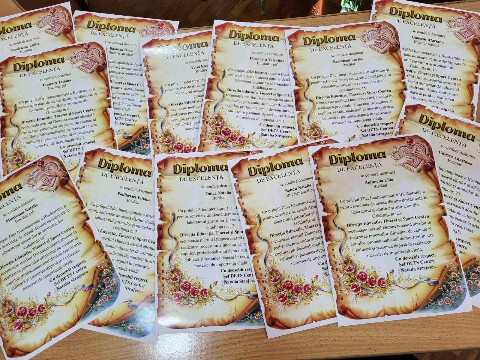Dragi bucătari-șefi, bucătari și bucătari auxiliari, primiți la acest moment important diplomele de excelență ale Șefei DETS Centru, Natalia Străjesco ca însemn al activității de aleasă dăruire desfășurată în laboratorul gusturilor și aromelor din instituția de învățământ în care profesați.